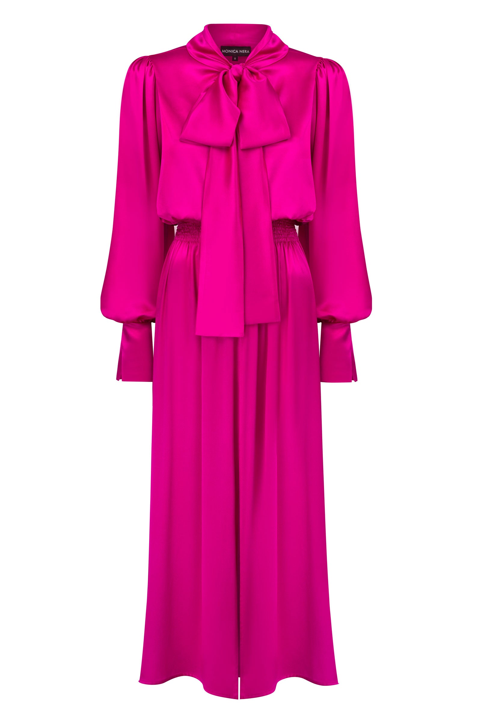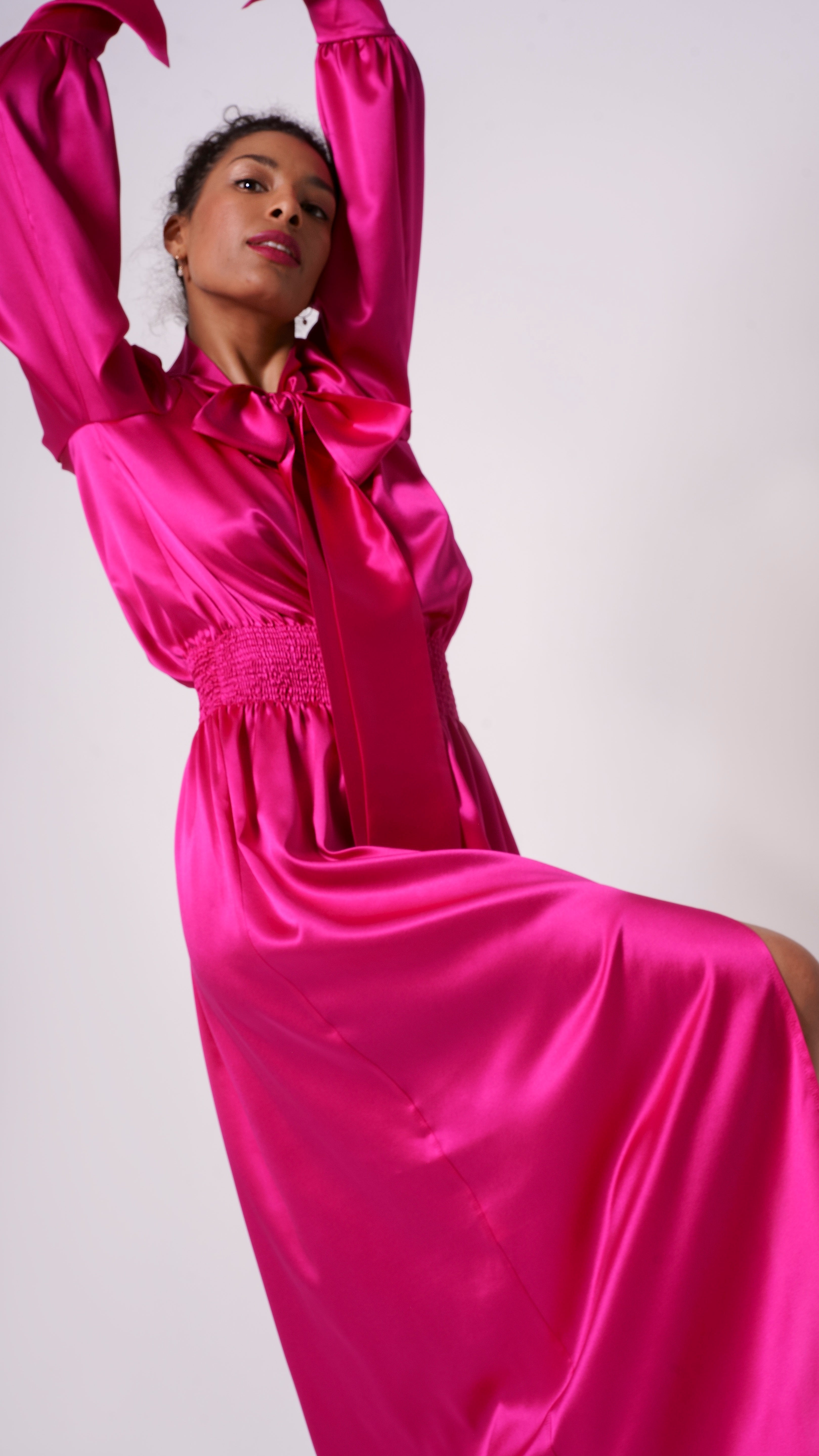 The Maria Dress is the embodiment of timeless elegance with a modern edge. Crafted from 100% pure silk, it drapes fluidly around the body, reflecting light with a soft, luxurious sheen. The vibrant fuchsia tone radiates confidence and femininity, making it the perfect statement piece for both day and evening occasions.
