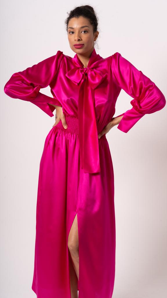 Designed with a graceful bow-tie neckline and softly gathered shoulders, Maria captures the essence of refined glamour. The long, flowing sleeves finish with structured cuffs, while the elasticated waistline accentuates the silhouette with effortless comfort. The skirt falls beautifully to a midi length, moving with every step in a dance of sophistication and ease.