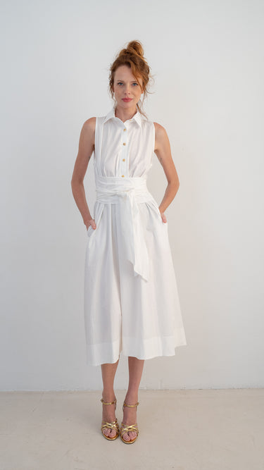 La robe Mabel est un incontournable de l'été, sans manches, confectionnée dans notre popeline de coton blanche immaculée signature. Elle présente un col pointu, une fermeture boutonnée sur le devant avec d'élégants boutons dorés et un large lien amovible à la taille qui sculpte et définit la silhouette. La jupe midi trapèze offre aisance et liberté de mouvement, tandis que les poches latérales dissimulées apportent une touche pratique au quotidien.