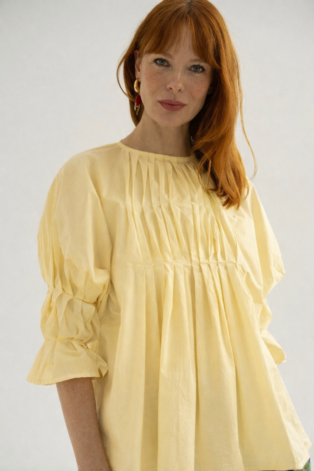 Effortlessly elevated and unmistakably Monica Nera. The Sara Top is crafted from our signature eco-certified cotton poplin, designed to bring comfort and modern structure to your wardrobe. Featuring intricate front pleating and relaxed volume through the body, this top combines soft femininity with architectural edge. The gathered sleeves tie at the cuffs for a subtle, sculptural finish.